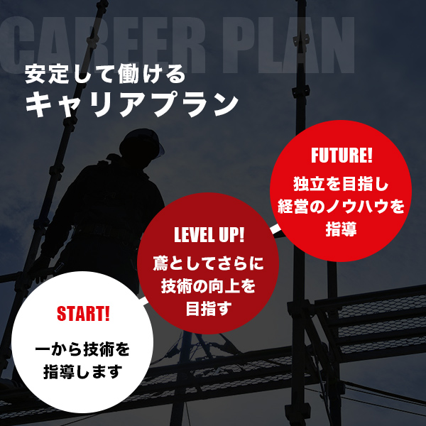 鳶の仕事に興味を持ち、「将来、役に立つ技術を学びたい!」「資格を取りたい!」「ゆくゆくは独立して自分の会社を持ちたい!」という夢をお持ちの方なら、活躍できる環境が当社にはあります。